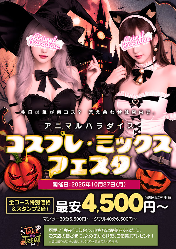 10/27(月)限定!今日は誰が何コス? 答え合わせは店内で♡全コース特別価格&スタンプ2倍、最安4,500円〜!TRICK or TREAT★女の子から“特別ご褒美”プレゼント♪※なくなり次第終了。